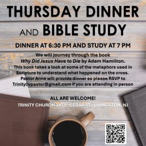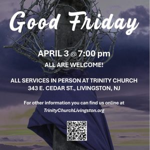 You are always welcome here at Trinity Church, as people have been throughout our 60+ years! In person or online, we love to welcome new people into our fellowship. We are a group from all walks of life who have heard God’s call through Jesus Christ to receive God’s love and newness of life, to serve God and to care for people and the world God has given us. Follow us on Facebook Trinity Church in Livingston NJ or search on Facebook for @TrinityChurchLivingstonNJ